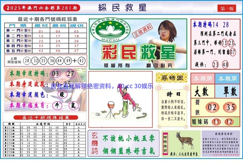 281期:解彩民救星【不該桃小桃五零,個個藍珠好吉氣】 解:不該桃小桃五零,個個藍珠好吉氣。解羊龙马兔鸡蛇 七肖:羊龙马兔鸡蛇狗 大小数:大数 |